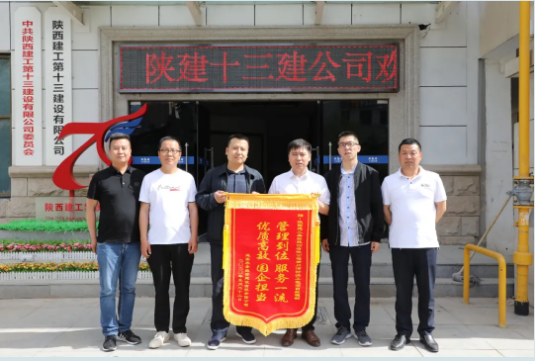 5月26日, 延安水務投資建設有限責任公司工程部部長侯海濤一行,為陜建十三建公司送來一面寫著“管理到位 服務一流 優(yōu)質(zhì)高效 國企擔當 ”的錦旗,并對十三建公司優(yōu)質(zhì)高效服務給予了高度評價。