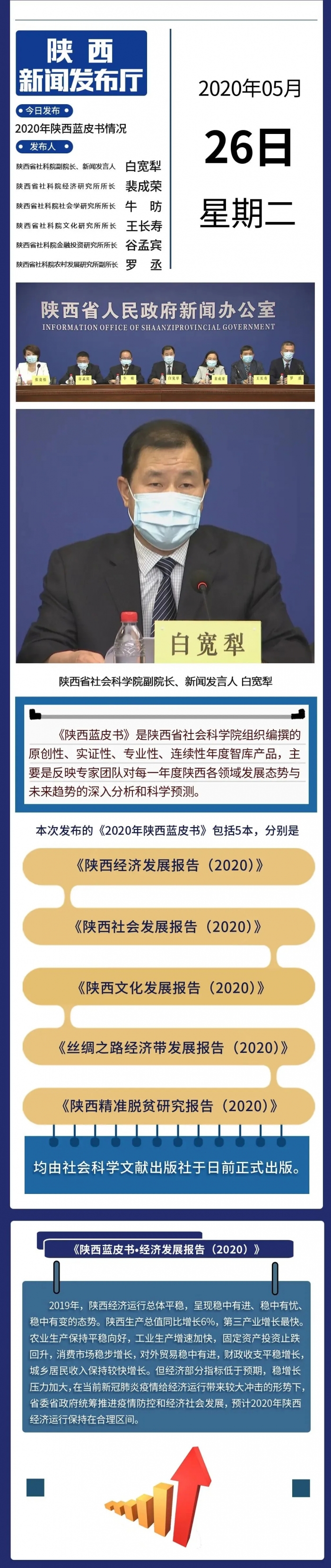 5月26日10時(shí),陜西省人民政府新聞辦公室舉辦新聞發(fā)布會(huì),邀請(qǐng)陜西省社會(huì)科學(xué)院副院長(zhǎng)、新聞發(fā)言人白寬犁,陜西省社會(huì)科學(xué)院經(jīng)濟(jì)研究所所長(zhǎng)裴成榮,社會(huì)學(xué)研究所所長(zhǎng)牛昉,文化研究所所長(zhǎng)王長(zhǎng)壽,金融投資研究所所長(zhǎng)谷孟賓,農(nóng)村發(fā)展研究所副所長(zhǎng)羅丞出席,介紹2020年陜西藍(lán)皮書(shū)情況并回答記者提問(wèn)。