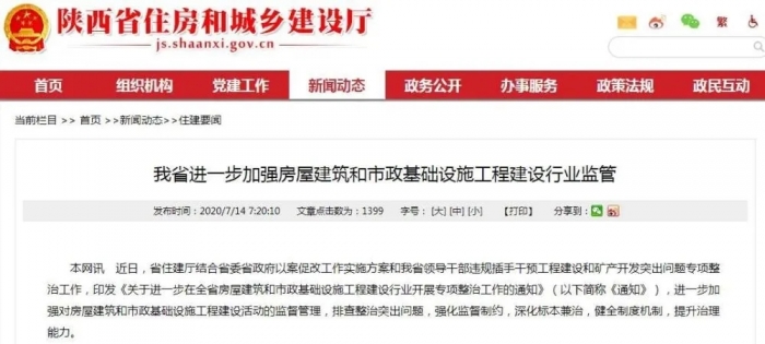 7月14日,陜西省住房和城鄉(xiāng)建設(shè)廳官網(wǎng)發(fā)布消息稱,近日印發(fā)了《關(guān)于進(jìn)一步在全省房屋建筑和市政基礎(chǔ)設(shè)施工程建設(shè)行業(yè)開展專項(xiàng)整治工作的通知》(以下簡稱《通知》),加強(qiáng)對房屋建筑和市政基礎(chǔ)設(shè)施工程建設(shè)活動的監(jiān)督管理。