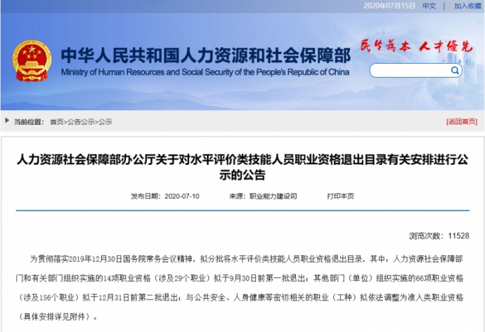 12月31日前,66項(xiàng)職業(yè)資格(涉及156個(gè)職業(yè))擬于第二批退出;