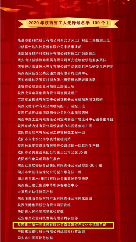 近日,陜西省三秦工匠、五一勞動(dòng)獎(jiǎng)表彰大會(huì)在西安隆重舉行,會(huì)議表彰了2020年三秦工匠 和陜西省五一勞動(dòng)獎(jiǎng)、工人先鋒號(hào)。陜西建工第十三建設(shè)有限公司南泥灣紅色文化小鎮(zhèn)項(xiàng)目部榮獲2020年“陜西省工人先鋒號(hào)”榮譽(yù)稱(chēng)號(hào)。
