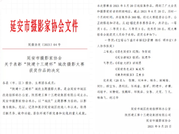 “陜建十三建杯”城改攝影比賽旨在用相機展示古城風貌,以鏡頭凸顯圣地氛圍,展現(xiàn)新時代之下延安市的發(fā)展之美、和諧之美。影賽自開展以來,得到了廣大攝影愛好者的積極參與、踴躍投稿,共收到攝影作品350余幅,經(jīng)過攝影協(xié)會專業(yè)評委嚴格公平評選,共評選出一等獎作品1幅,二等獎作品2幅,三等獎作品3幅,優(yōu)秀作品20幅。