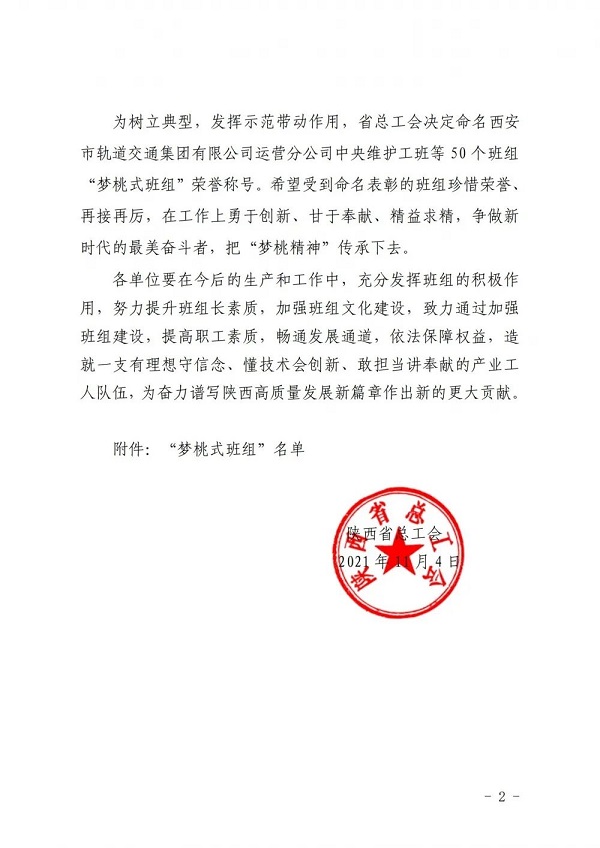 為進一步傳承和弘揚“高標準、嚴要求、行動快、工作實、搶困難、送方便”和“不讓一個伙伴掉隊”的“夢桃精神”,近日,陜西省總工會對全省50個優(yōu)秀班組進行了榮譽表彰,授予他們“夢桃式班組”榮譽稱號,集團延安南泥灣勞模工匠學院項目科技創(chuàng)新班組獲此殊榮。