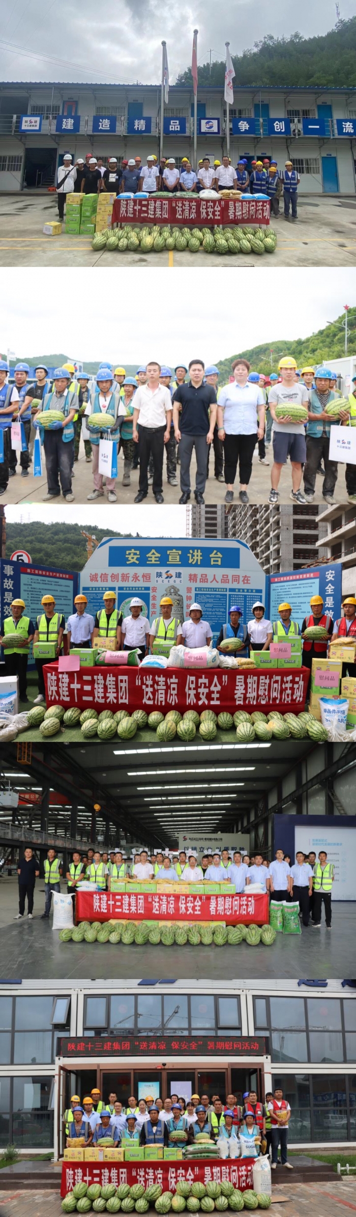 集團(tuán)總工程師王弘起,副總經(jīng)理?xiàng)钣篮?,副總?jīng)理張?chǎng)蝹ィ倳?huì)計(jì)師劉小衛(wèi),紀(jì)委書(shū)記、工會(huì)主席李靜分別前往延安市社會(huì)福利院遷建項(xiàng)目(一期)、延安南泥灣工匠學(xué)院項(xiàng)目、伴山樾谷·芳菲里項(xiàng)目、延安新型建材公司、信天游文創(chuàng)餐飲街區(qū)等項(xiàng)目開(kāi)展慰問(wèn)活動(dòng),代表集團(tuán)公司對(duì)高溫天氣堅(jiān)守在一線的廣大員工及工友表示親切的問(wèn)候和衷心的感謝,并為大家送上西瓜、白糖、綠豆、菊花、冰糖、飲料、花露水等防暑降溫物品。同時(shí),叮囑項(xiàng)目部要始終把安全放在首位,科學(xué)安排施工作業(yè)時(shí)間,做好后勤保障工作,制定防暑防汛工作預(yù)案,在確保一線施工作業(yè)人員健康安全的前提下抓質(zhì)量提進(jìn)度,緊盯項(xiàng)目節(jié)點(diǎn)目標(biāo),圓滿完成各項(xiàng)建設(shè)任務(wù)。
