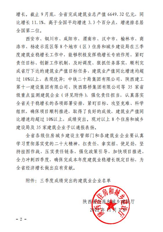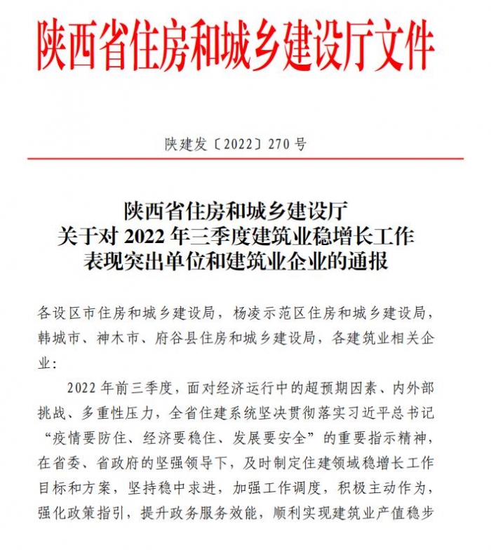 11月2日,陜西省住房和城鄉(xiāng)建設(shè)廳發(fā)布《關(guān)于對(duì)2022年三季度建筑業(yè)穩(wěn)增長(zhǎng)工作表現(xiàn)突出單位和建筑業(yè)企業(yè)的通報(bào)》,集團(tuán)被省住建廳評(píng)為“三季度成績(jī)突出建筑業(yè)企業(yè)”。
