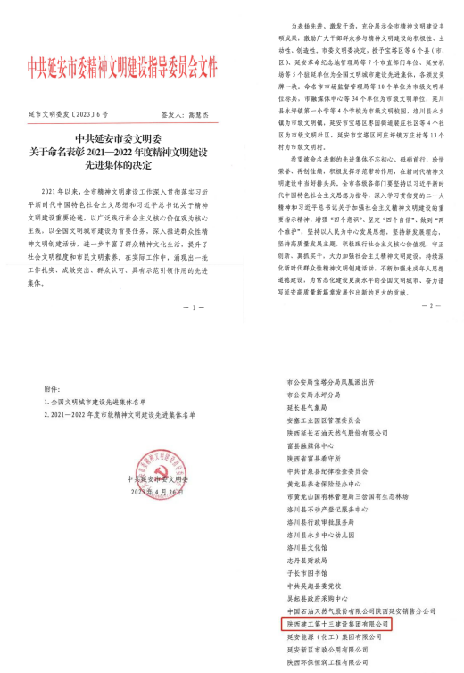 近日,延安市委表彰2021-2022年度精神文明建設(shè)先進集體。陜西建工第十三建設(shè)集團有限公司被評為“市級文明單位”。