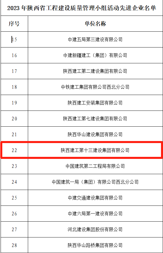 近日,陜西省建筑業(yè)協(xié)會(huì)表彰了2023年度陜西省工程建設(shè)優(yōu)秀QC小組、QC小組活動(dòng)先進(jìn)企業(yè)、卓越領(lǐng)導(dǎo)者、優(yōu)秀推進(jìn)者。集團(tuán)24項(xiàng)成果榮獲“2023年陜西省工程建設(shè)優(yōu)秀QC小組”(其中I類成果獎(jiǎng)11項(xiàng),II類成果獎(jiǎng)12項(xiàng),III類成果獎(jiǎng)1項(xiàng))