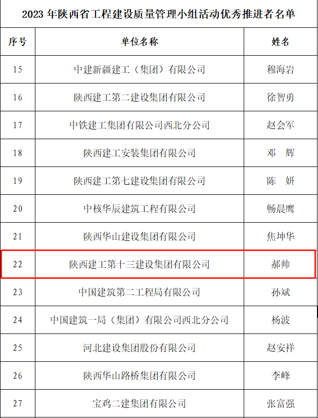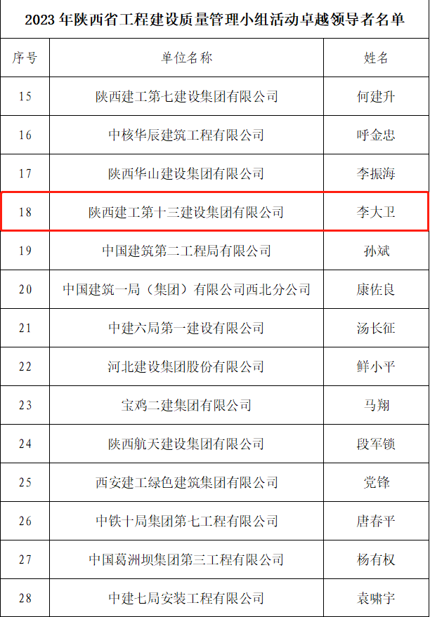 此外,陜西建工第十三建設(shè)集團(tuán)有限公司被評(píng)為“2023年陜西省工程建設(shè)質(zhì)量管理小組活動(dòng)先進(jìn)企業(yè)”;集團(tuán)副總工程師、科技質(zhì)量部部長(zhǎng)李大衛(wèi)被評(píng)為“2023年陜西省工程建設(shè)質(zhì)量管理小組活動(dòng)卓越領(lǐng)導(dǎo)者”;郝帥被評(píng)為“2023年陜西省工程建設(shè)質(zhì)量管理小組活動(dòng)優(yōu)秀推進(jìn)者”。