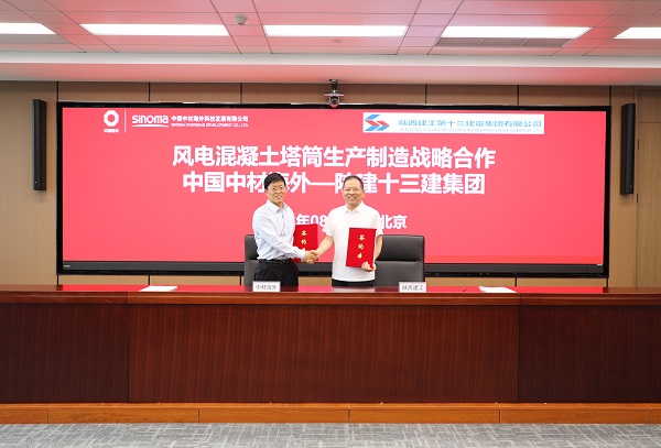 8月1日,集團與中國中材海外科技發(fā)展有限公司在北京就風(fēng)電混凝土塔筒生產(chǎn)制造簽訂戰(zhàn)略合作協(xié)議并簽訂陜西榆林定邊項目混凝土塔筒預(yù)制管片采購合同。中國中材海外科技發(fā)展有限公司黨委書記、執(zhí)行董事高超,集團黨委書記、董事長卜國平代表雙方簽約并致辭。
