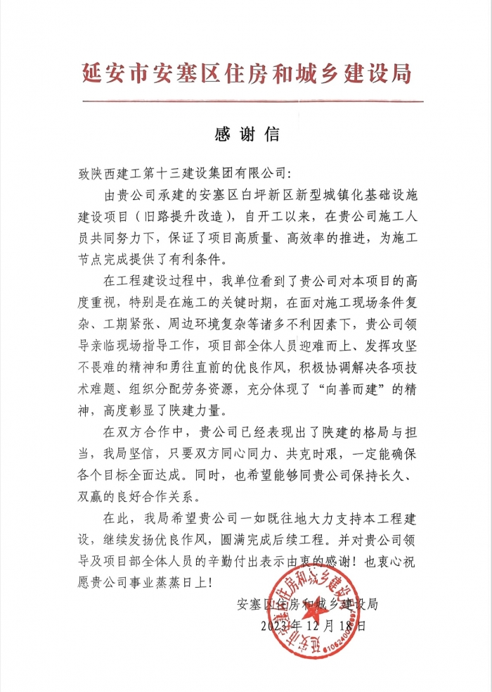 近日,集團第一工程公司施工的安塞區(qū)白坪新區(qū)新型城鎮(zhèn)化基礎(chǔ)設(shè)施建設(shè)項目收到來自安塞區(qū)住建局的感謝信,對集團項目部管理團隊在施工過程中的迎難而上、攻堅克難,高質(zhì)量、高效率推進項目建設(shè)予以高度贊揚。